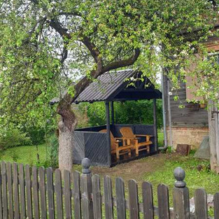 Ervīns Kārkliņš un Ritvars Sprukuls-Circenis no ieceres līdz uzstādīšanai realizēja lapenes projektu. Daļēji slēgtās sienas pastiprināja dēlīšu apšuvums, bet jumta konstrukcija vizuālo efektu ieguva ar spāru saitēm un šīfera segumu.